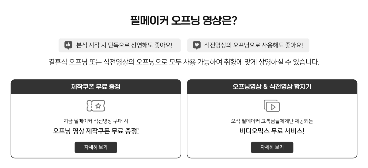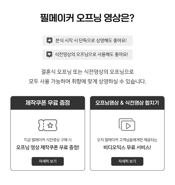 저희는 기존 식전영상만 생각하다가, 우연히 본 오프닝 영상에 반해 추가로 진행했는데요!!! 순서를 식전-오프닝 반대로 해서 오프닝이 30분 내내 식장에 나왔는데 다들 영화냐면서 너무 신박하다며 , 영상 칭찬을 어찌나하던지!!! 오프닝,식전 모두 퀄리티랑 내용,구성 완벽했다구 칭찬많이 받았습니다 감사합니다~~^^ 제작도 쉽고, 사진만 기존 셀렉 잘해놓으면 순식간에 만듭ㄴ당